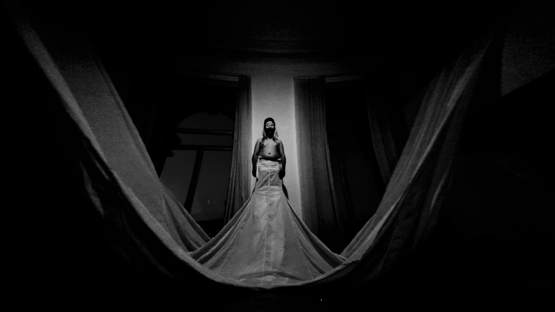In this performance, the crescent moon reaches its most monumental form: an 80-square-meter white tunic extending into a vast crescent shape, becoming both a bodily prosthesis and a ritual bridge between anatomy and artistic space. The fabric’s dimensions match exactly those of the artist’s school-house, making the weight of trauma and its persistent presence tangible.