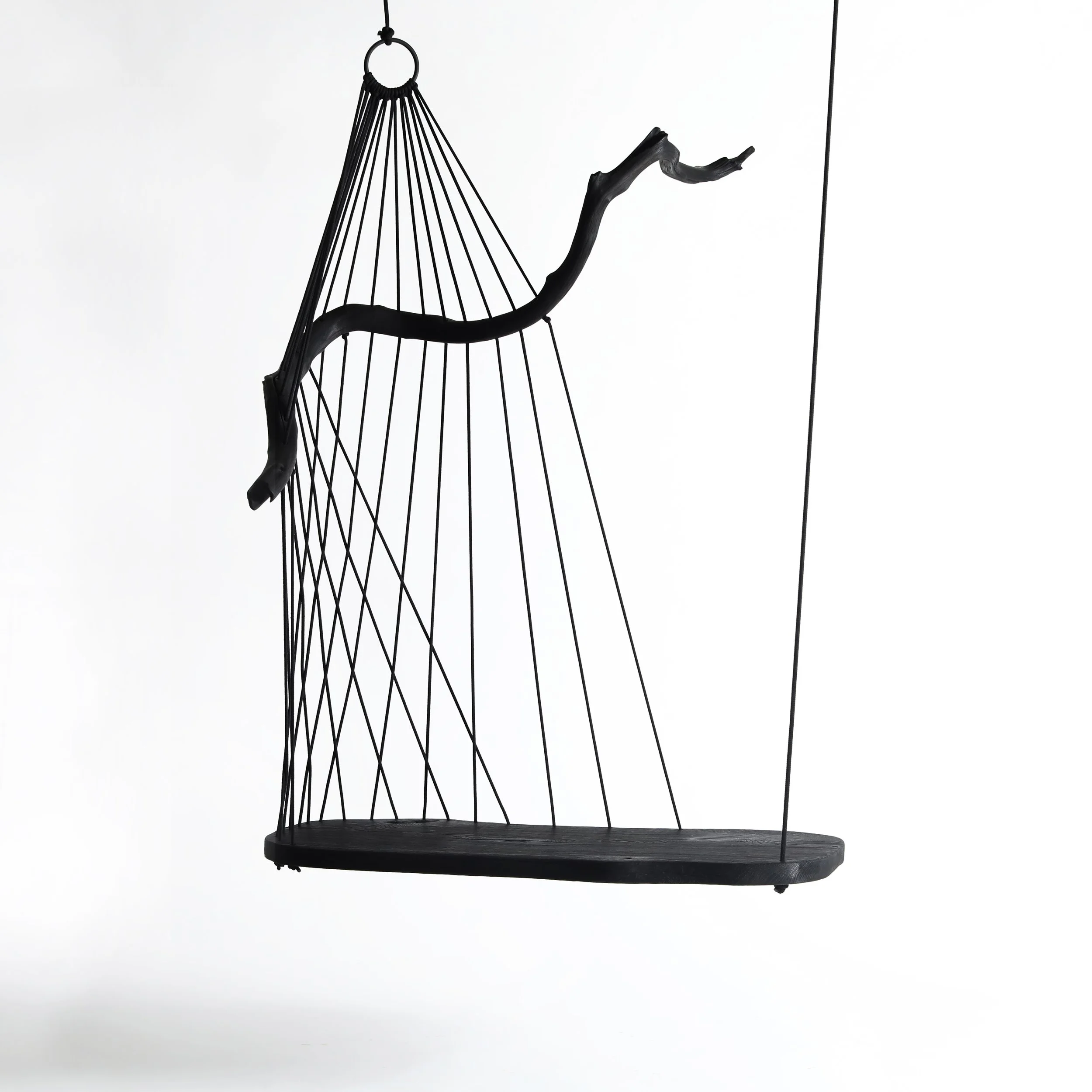 Modern black swing with metal strings and wooden seat suspended from a hook.