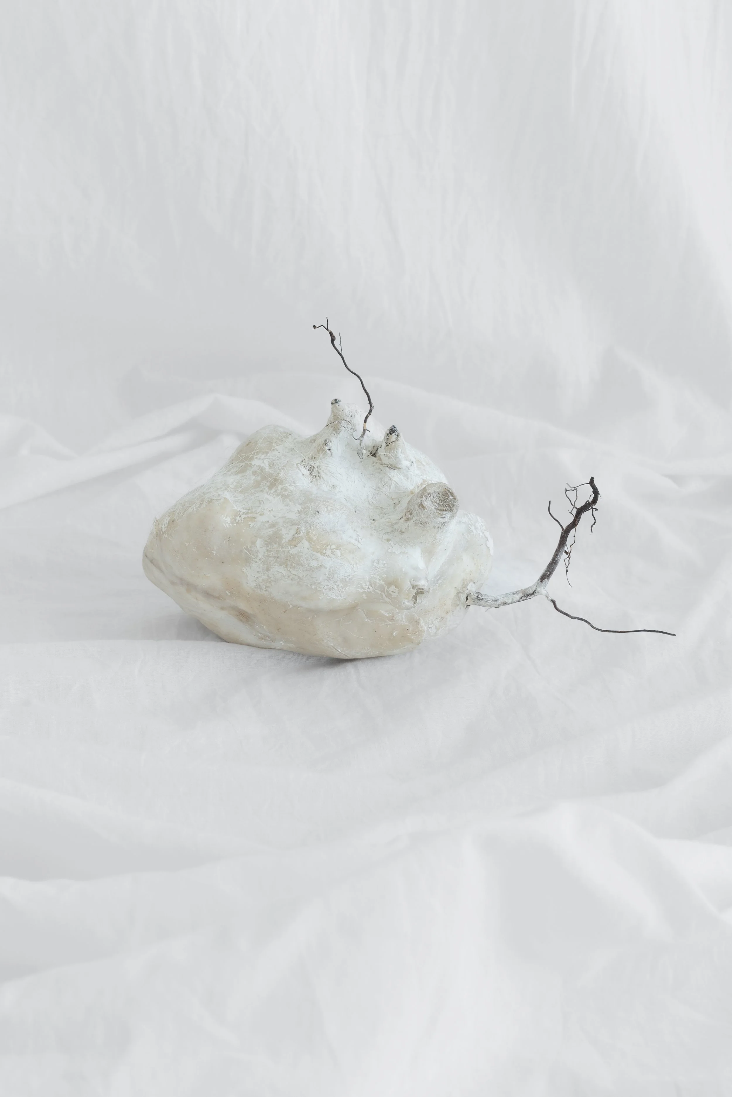 In the center of the room lies a heart, A heart unlike any other, crafted by Melanie, Made of wax, twisted roots, and horsehair strands, It evokes a sense of the beauty and fragility of life's strands.