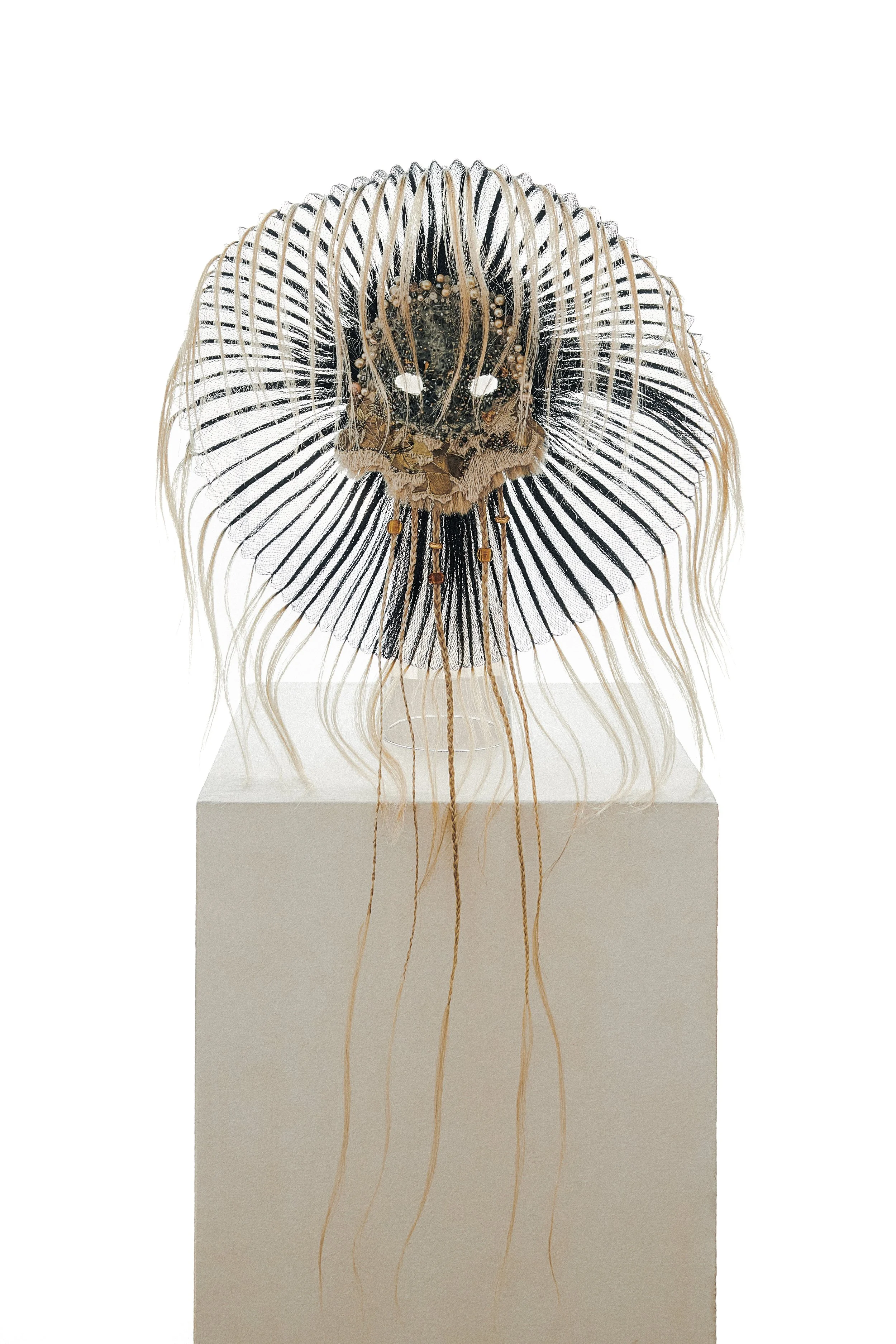 Murielle Nisse is a French artist who trained at the Paris Opera in costume design. Lace, pearls, braided hair, wool, her masks are made up of a multitude of noble materials selected by the artist herself before being meticulously assembled by hand, a technique inspired by many civilizations from all over the world. . Through her artistic approach, the designer questions the notion of femininity and the aesthetic codes in vogue, to rethink the transformation and staging of her profile according to new forms.Although sometimes disturbing, her work is not no less intriguing and stunning.